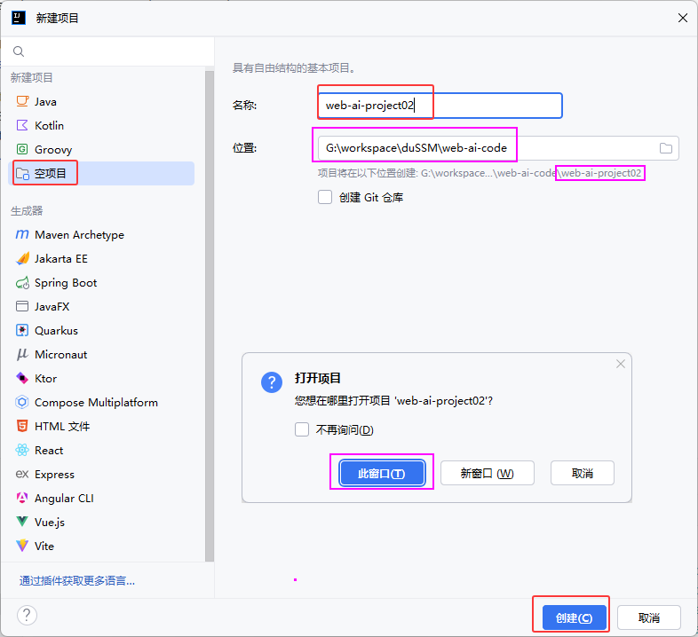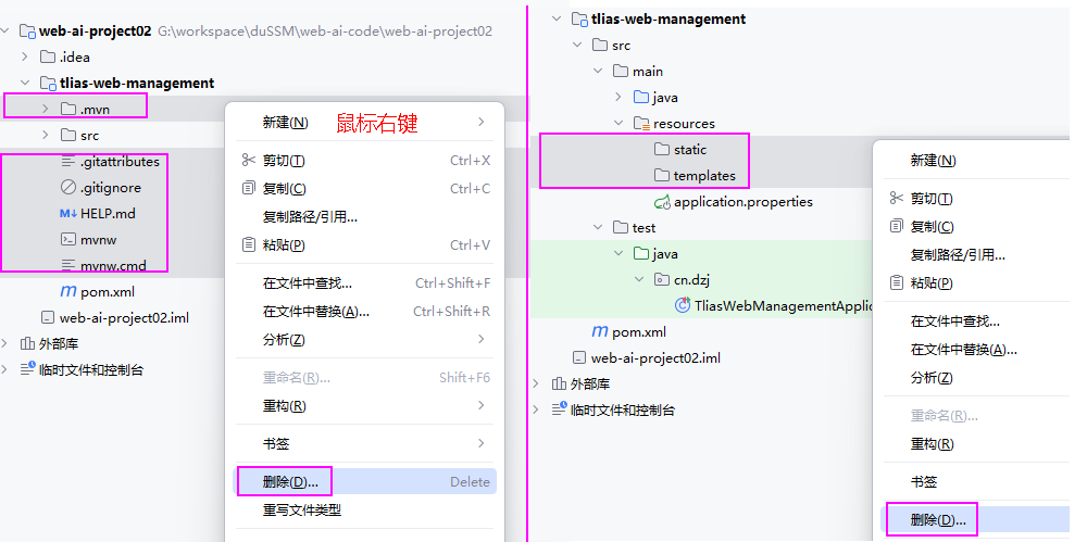 - 创建空项目(工作空间web-ai-project02),创建SpringBoot工程(模块tlias-web-management),并引入web开发起步依赖、mybatis、mysql驱动、lombok。