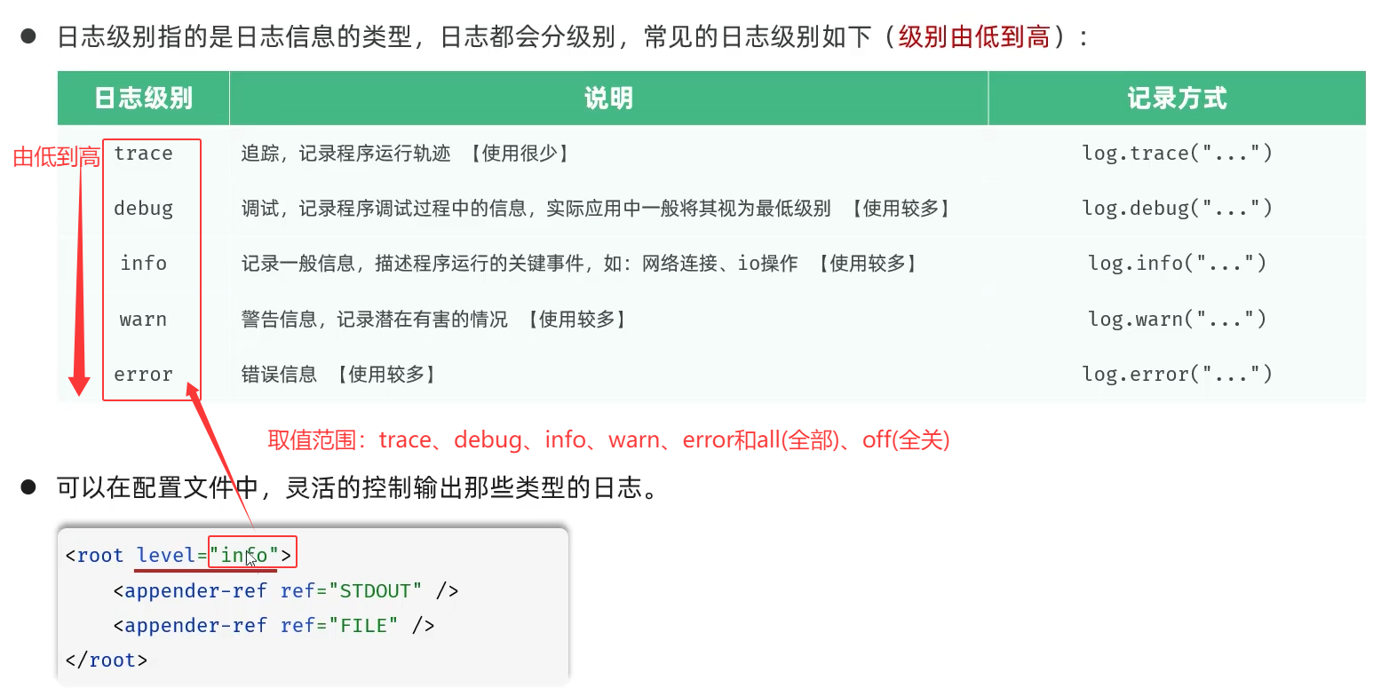 | error | 错误信息 【使用较多】 | log.error("...") |