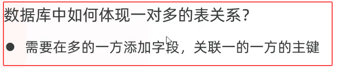 - 一对多的关系如何实现? 在数据库表中多的一方,添加字段,来关联一的一方的主键。