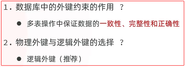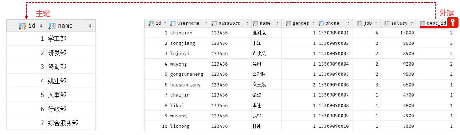 - 原因:目前上述的两张表,在数据库层面,并未建立关联,所以是无法保证数据的一致性和完整性的 。
