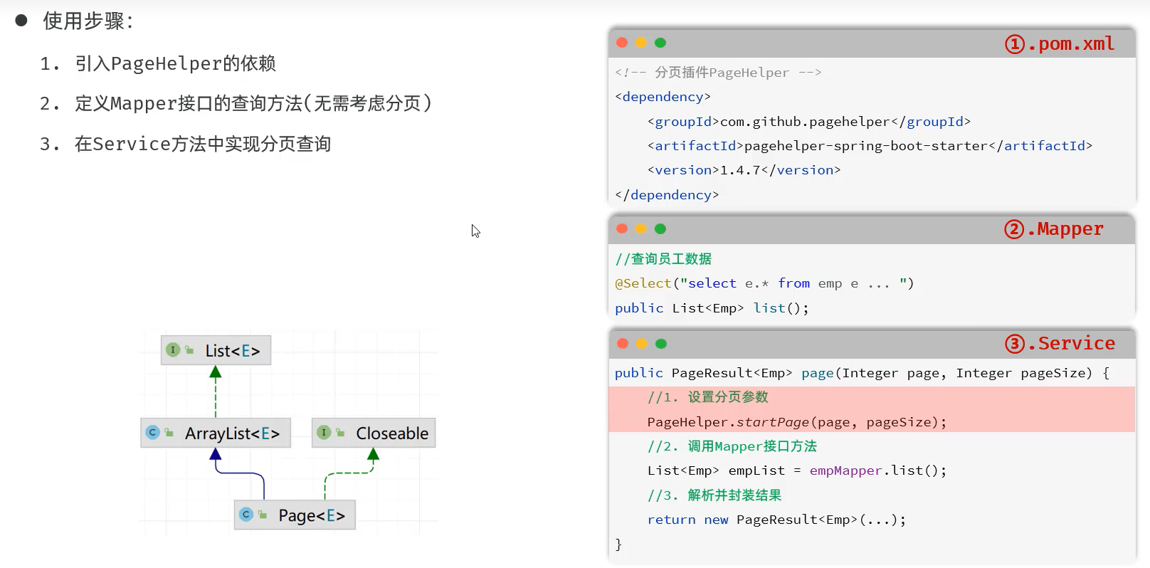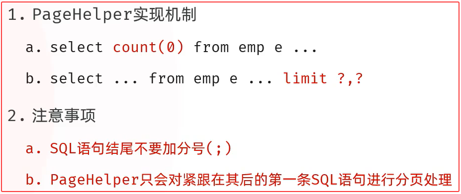 - PageHelper只会对紧跟在其后的第一条SQL语句进行分页处理