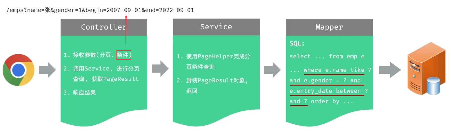 请求参数:/emps?name=张&gender=1&begin=2007-09-01&end=2022-09-01&page=1&pageSize=10