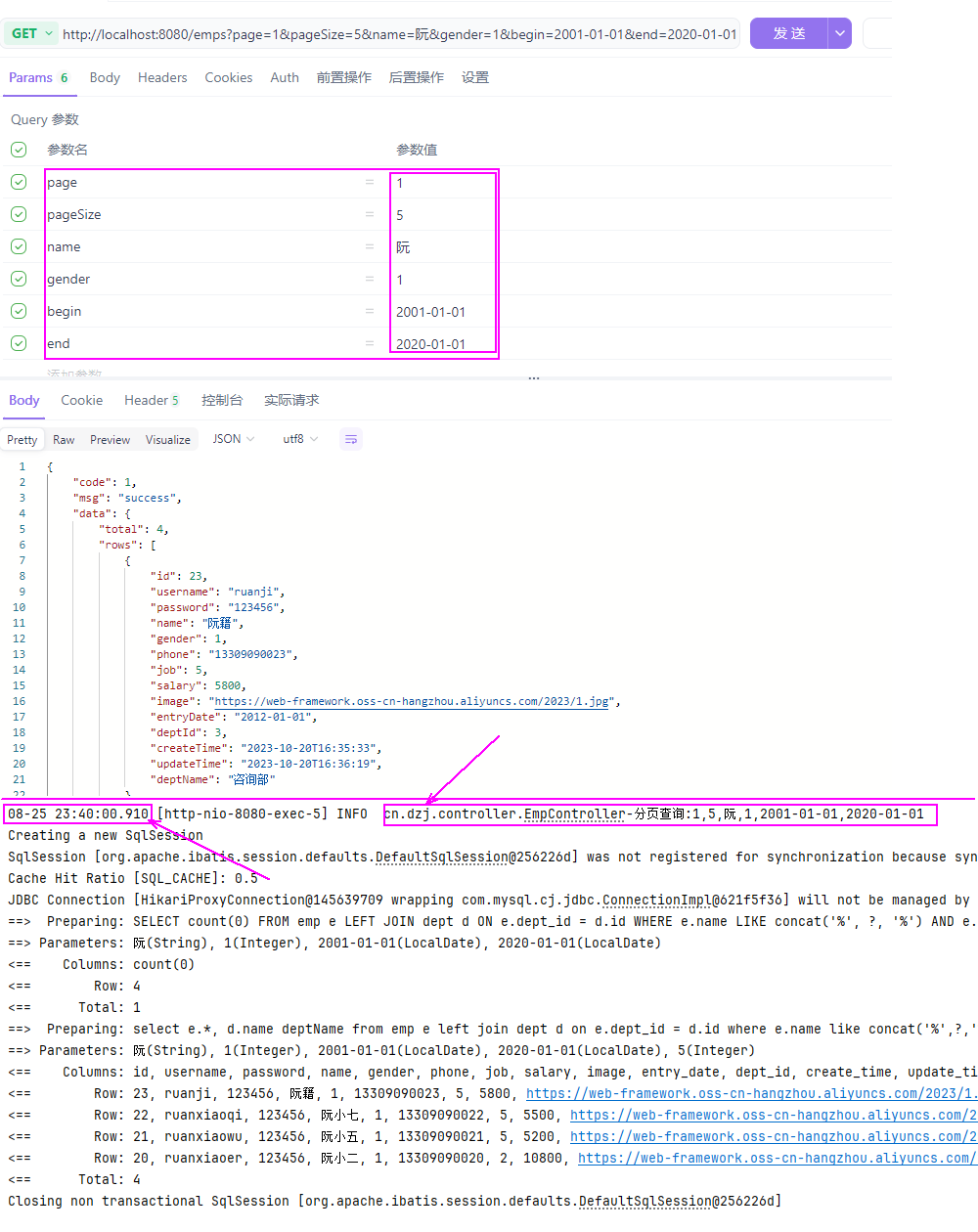 List<Emp> empList = empMapper.list3(name, gender, begin, end);