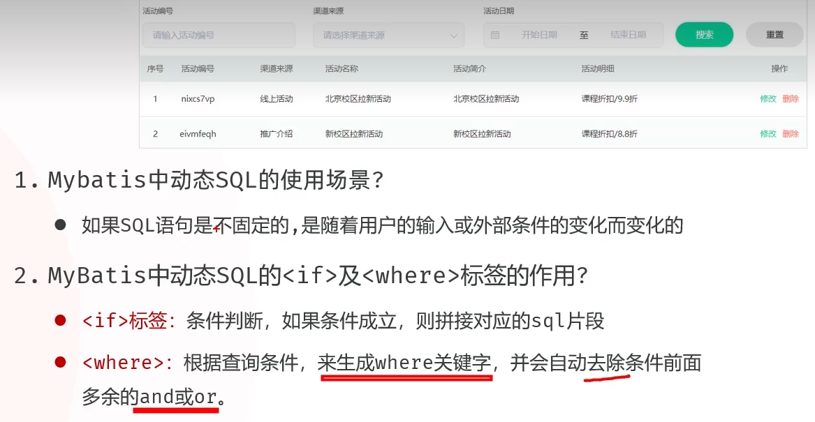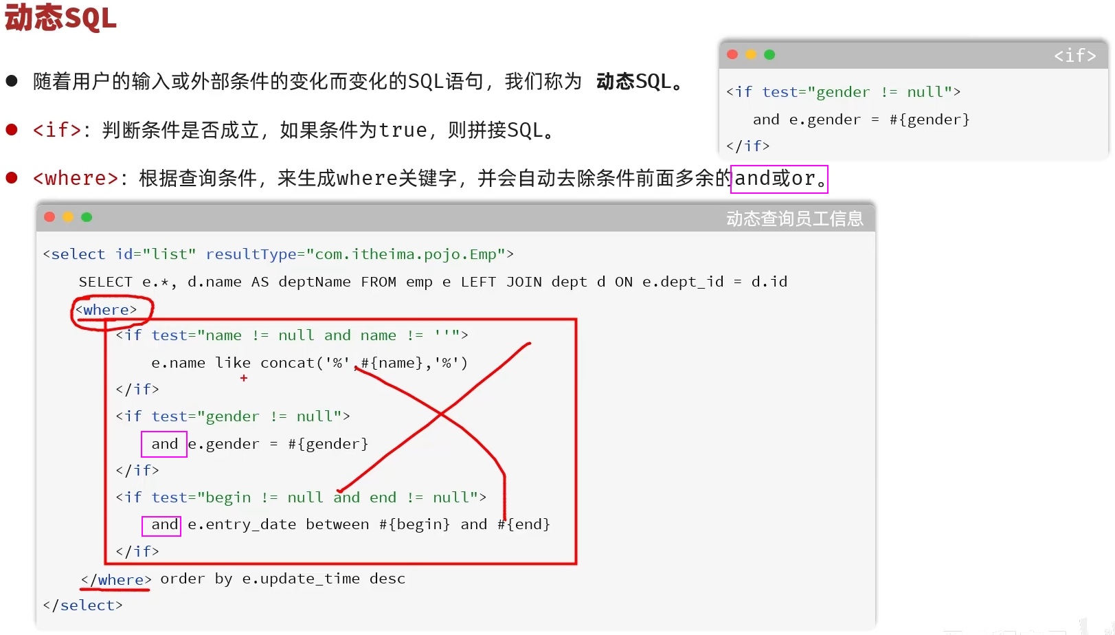 <if>标签:条件判断,如果条件成立,则拼接对应的sql片段<where>:根据查询条件,来生成where关键字,并会自动去除条件前面多余的and或or。