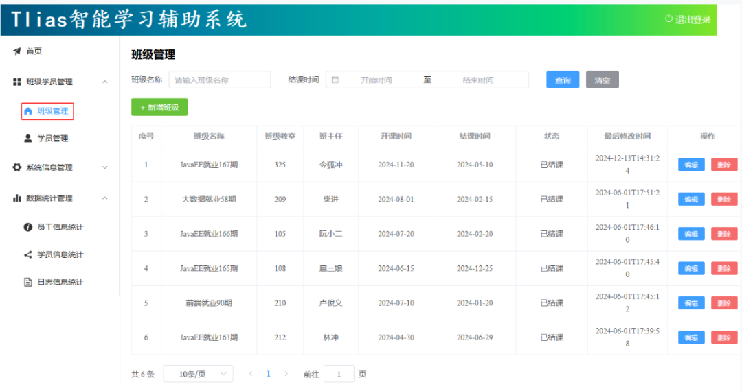 - 班级管理:班级列表查询、删除班级、添加班级、修改班级。