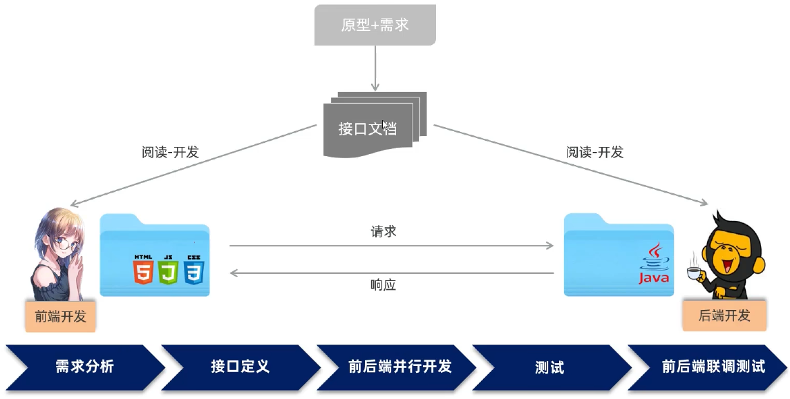 - 需求分析 -> 接口定义 -> 前后端并行开发 -> 测试 -> 前后端联调测试