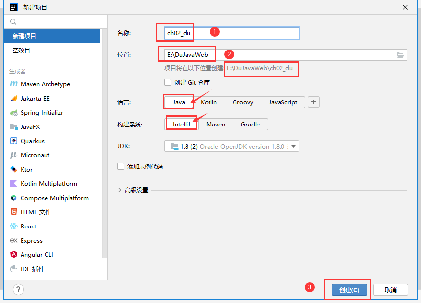 (1) 启动IntelliJ IDEA开发工具,单击工具栏中的[File] →[new] →[Project] 选项,此时会弹出一个New Project界面。选新建项目,①输入项目名称:如ch02_zjy;②输入或确定本次JavaWeb教学源代码存储位置,如E:\zjyJavaWeb,语言和构建系统选Java和IntelliJ;③【创建】。