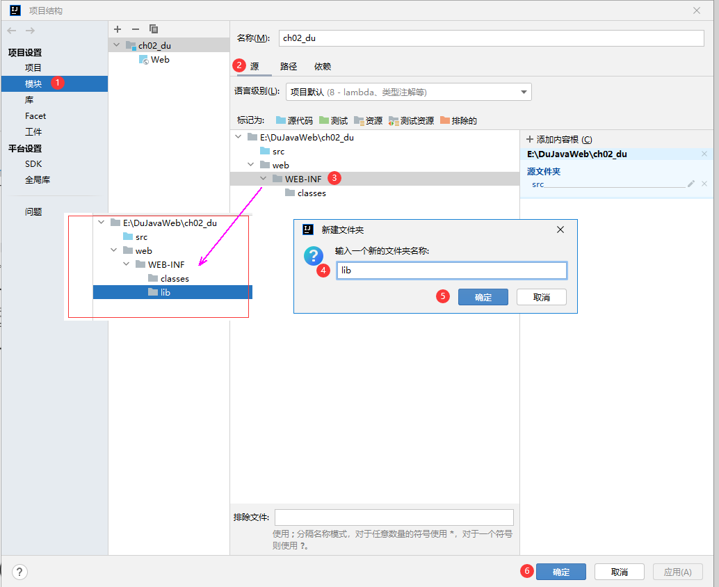 (4) 在Project Structrue界面中单击左侧菜单中的"Mozjyles" 选项,单击"Source" 配置项,在项目web文件夹下的WEB-INF文件夹下创建classes和lib文件夹。