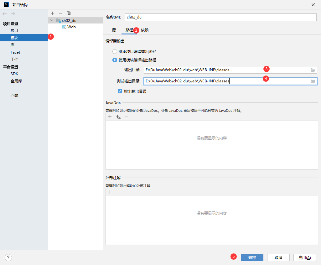 (5) 单击Project Structrue界面的"Paths" 配置项,将output path与Test output path的地址修改为Project Structrue界面中创建的classes的地址,该操作的作用是配置所有编译为.class的文件都编译输出在此文件夹下。