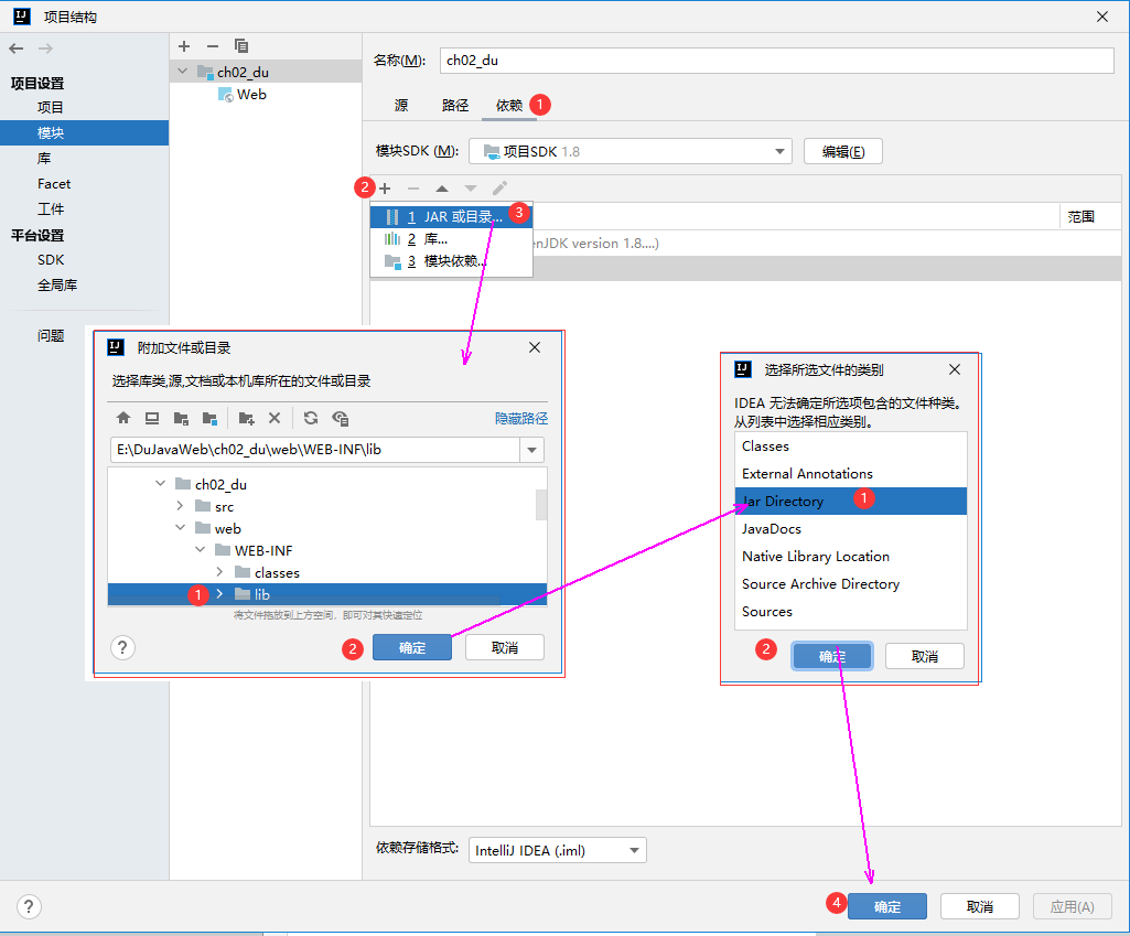 (2) 右击项目如[ch02_zjy]选【添加框架支持...】,弹出【添加框架支持】界面,选①JavaEE;②Web应用程序;③版本4.0;④创建Web.xml;⑤【确定】。