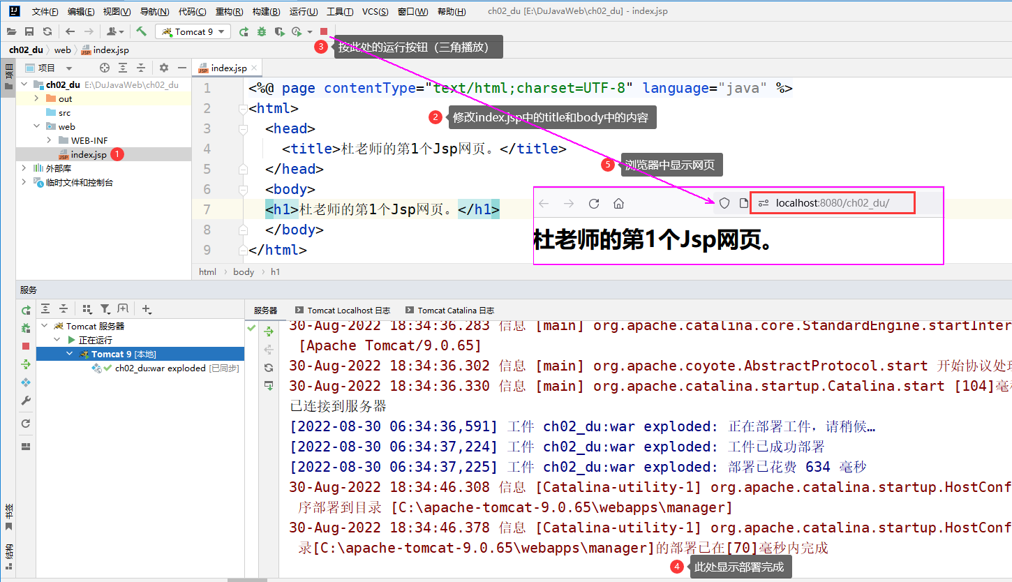 (16) 在IDEA菜单栏中单击的[Run] →[Run Tomcat ]启动Tomcat进行测试。在浏览器输入项目资源地址localhost:8080/ch02_zjy/index.jsp进行访问。