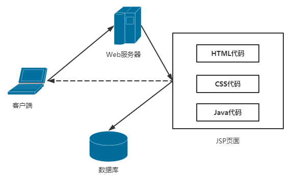 在JSP网页开发的初级阶段,JSP页面包含了几乎所有的web功能:(1) 向服务器提交Web请求,含请求界面和请求数据;(2) 直接访问数据库并进行业务处理;(3) 向客户端发送响应,含响应界面和响应数据,JSP页面文件中包含了大量的html、css、js和图片等静态资源和嵌入了大量的访问动态资源的代码,含访问数据库、业务逻辑处理等Java代码。