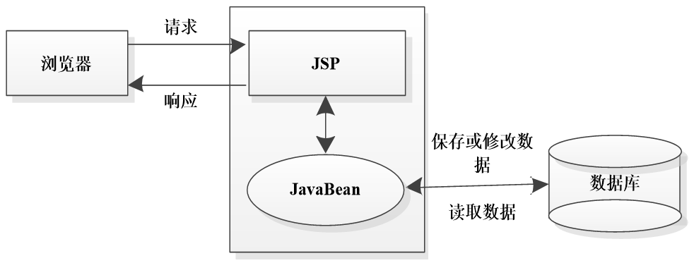 如果使HTML代码与Java代码相分离,将Java代码单独封装成为一个处理某种业务逻辑的类,然后在JSP页面中调用此类,可以降低HTML代码与Java代码之间的耦合度,简化JSP页面。提高Java程序代码的重用性及灵活性。这种与HTML代码相分离,而使用Java代码封装的类,就是一个JavaBean组件。在Java Web开发中,可以使用JavaBean组件完成业务逻辑的处理。应用JavaBean与JSP整合的开发模式如下图所示。