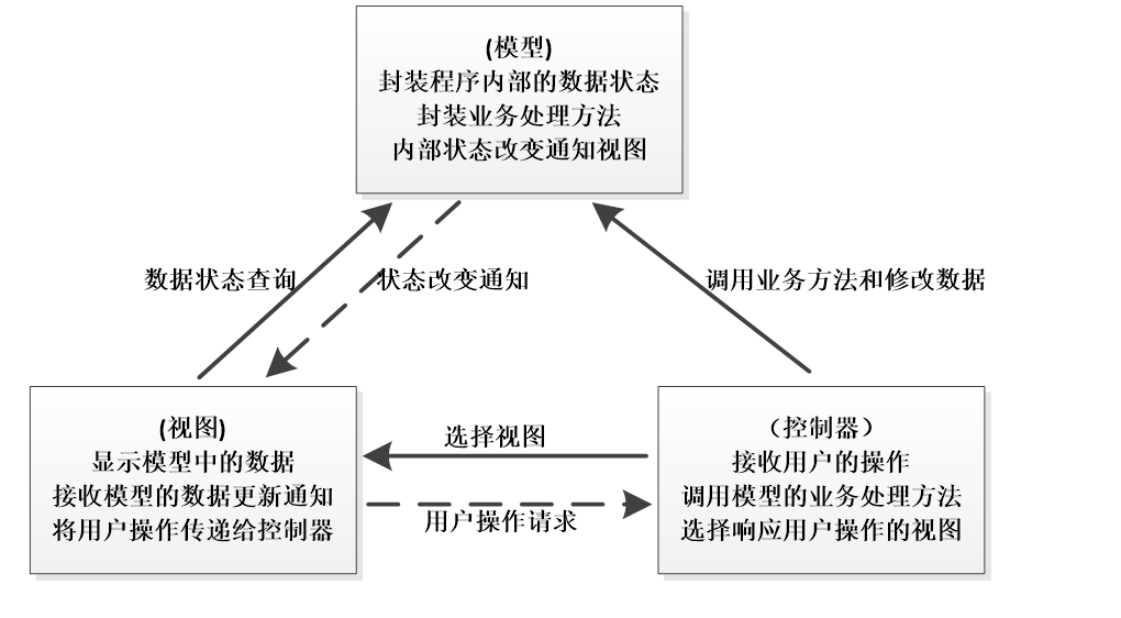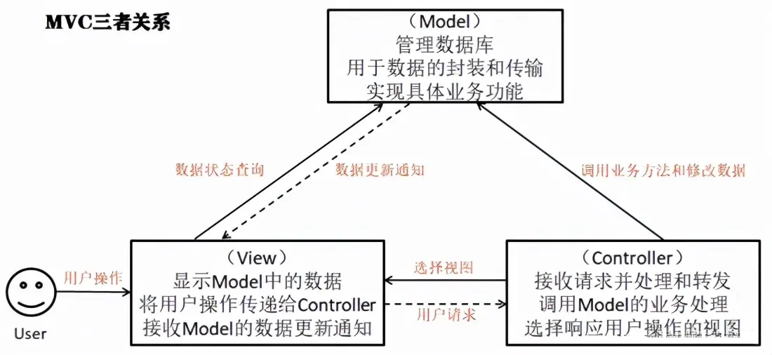 用户通过View操作软件,View将请求传递给Controller,Model负责数据的管理,View负责与用户交互,Controller负责对用户的请求进行响应,同时,当数据更新时会传给View然后更新页面。